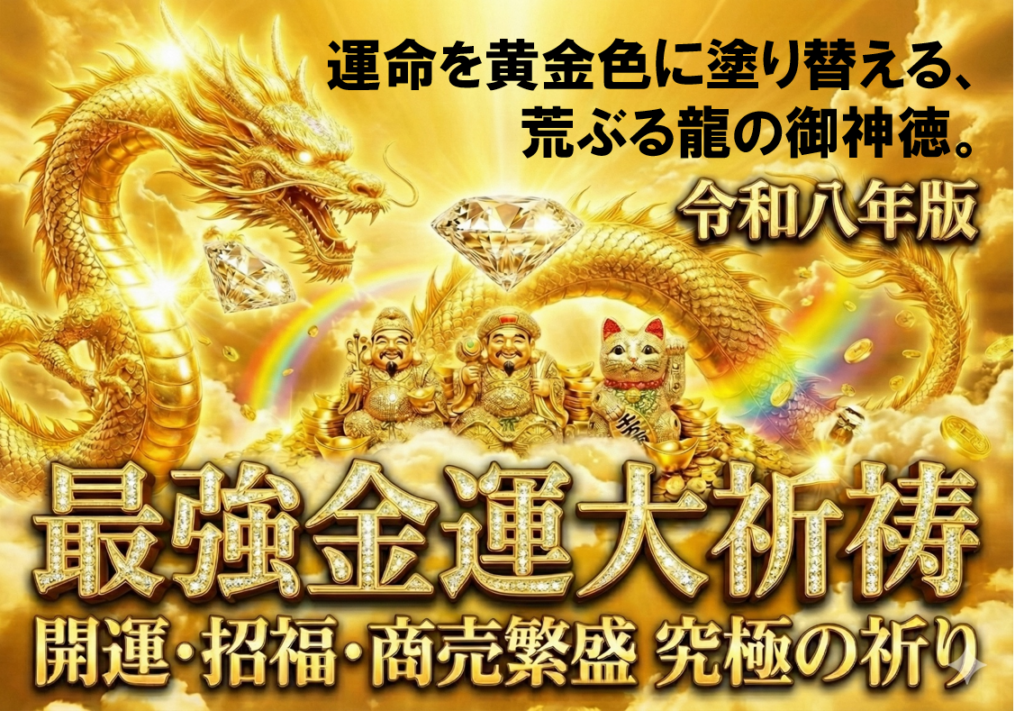 新しい年を迎え、さらなる金運上昇、商売繁盛、事業発展を願う特別なご祈祷です。 金吾龍神社が誇る金運の御神徳により、皆様の豊かな一年を後押しいたします。